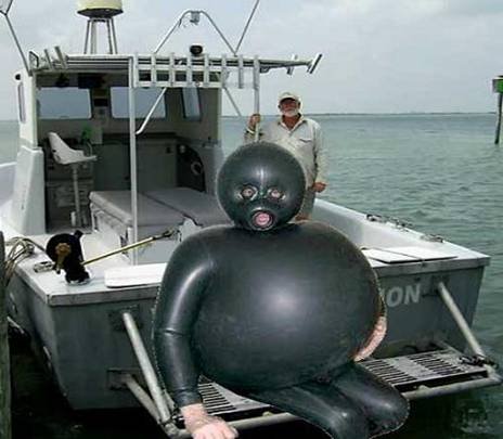 Para seu bem e de toda a comunidade do mergulho, procure largar toda a flatulência provocada pelo café da manhã ANTES de vestir o fato de mergulho! Na imagem podem os efeitos adversos do desrespeito por esta simples norma, sofridos pelo mergulhador João Brito e Cunha durante a recente estadia no Diving Center Dunas do Sal (ao fundo, a presença incontestável do mestre João Guedes)...